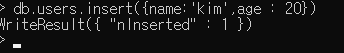 다음 명령을 입력시 users 컬렉션이 자동으로 생성되며 그안에 파라미터로 전달한 JSON 객체가 추가됩니다. 컬렉션 내에 추가한 객체이니 도큐먼트가 됩니다.