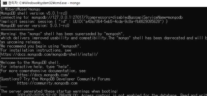 활성화 이후 새로운 터미널을 열어(윈도우의 경우 명령 프롬프트 또는 파워셸) mongo 라는 명령어를 입력합니다. 그러면 아래와 같이 버전정보가 출력되면 몽고디비 데이터베이스와 연결된 셸이 실행됩니다.