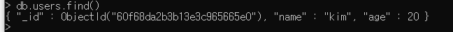 이후 다음 명령을 통해 조회해보겠습니다 이떄 find는 db내에서 조회를 의미합니다.
