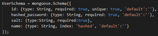 이제부터 본격적으로 Hash 와 Salt를 이용한 암호화를 다루어보겠습니다. 가장먼저 스키마의 정의는 다음과 같습니다. id, hashed_password, salt, name 네가지 항목으로 구성했으며 각 컬럼(필드)에는 default 속성을 모두 추가했습니다. 추가한 유저가 하나도 없어도 일단 DB는 존재해야하기 떄문입니다. id 값만 유니크하게 해주었습니다. 타입은 모두 String입니다.