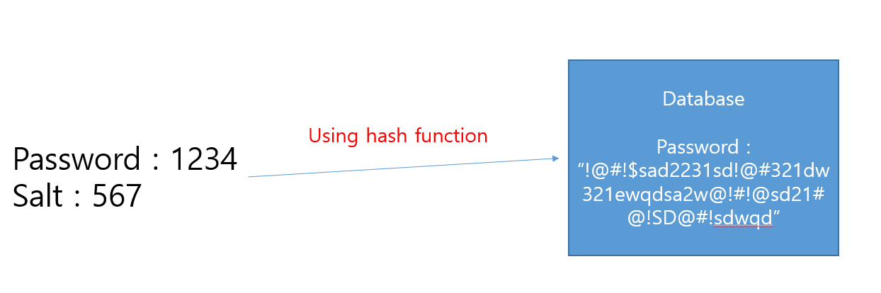 그래서 추가된것이 랜덤한 조미료인 Salt입니다. 비밀번호를 해시함수에 넣기전에 랜덤한 조미료 몇글자를 섞어주는것입니다. 이 Salt는 항상 랜덤하게 만들어지기떄문에 가능한원리입니다.