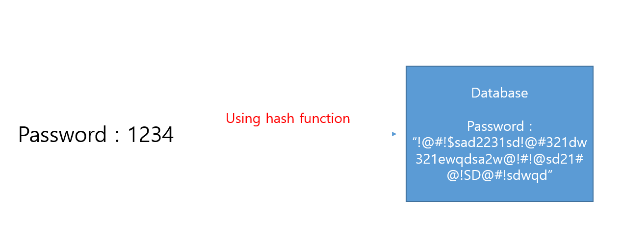 그렇다면 어떻게 수많은 비밀번호를 직접 DB에 삽입하지 않을수 있을까요? 그 방법은 비밀번호 인풋을 특수한 함수를 통해 전혀다른 기호와 문자, 숫자들의 조합으로 바꾸는 것입니다. 이러한 함수를 Hash function이라 합니다. 해쉬함수를 통해 특수한 조합으로 바꾸지만 동일한 input에 대한 output은 항상 동일합니다. 비밀번호를 실제와 다르게 저장한다면 유저 데이터를 조회하는 관리자도 비밀번호를 쉽게 알아낼수 없을것입니다.