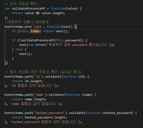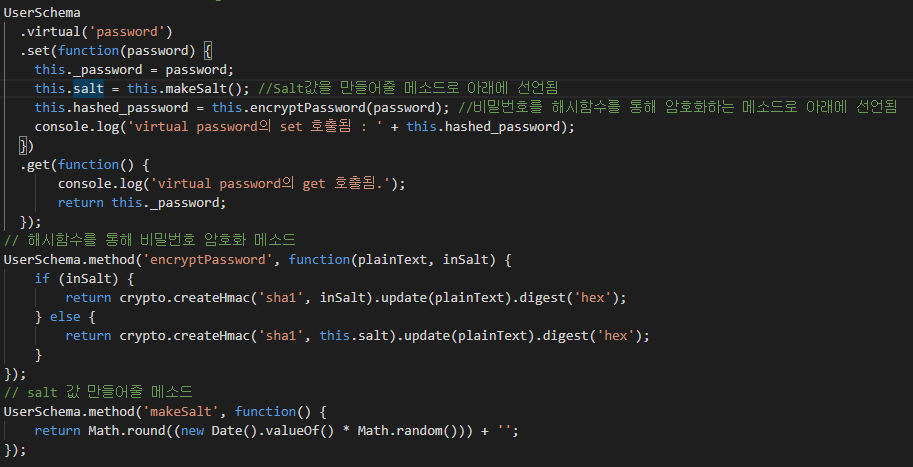 생성한 스키마 객체의 .virture.set 메소드를 통해 몽고DB에는 저장되지 않는 가상의 속성인 password를 정정의해줍니다.