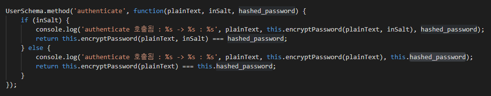 다음은 암화화된 비밀번호와 입력된 비밀번호를 비교하는 인증메소드입니다. 매개 변수인 plainText 와 inSalt로 encryptPassword 메소드를 실행해서 hashed_password와 비교하는 방식으로 인증합니다.