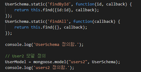 마지막으로 조회를 위한 메소드 두가지를 추가해준 이후 스키마를 users2 라는 모델로 정의해줍니다.