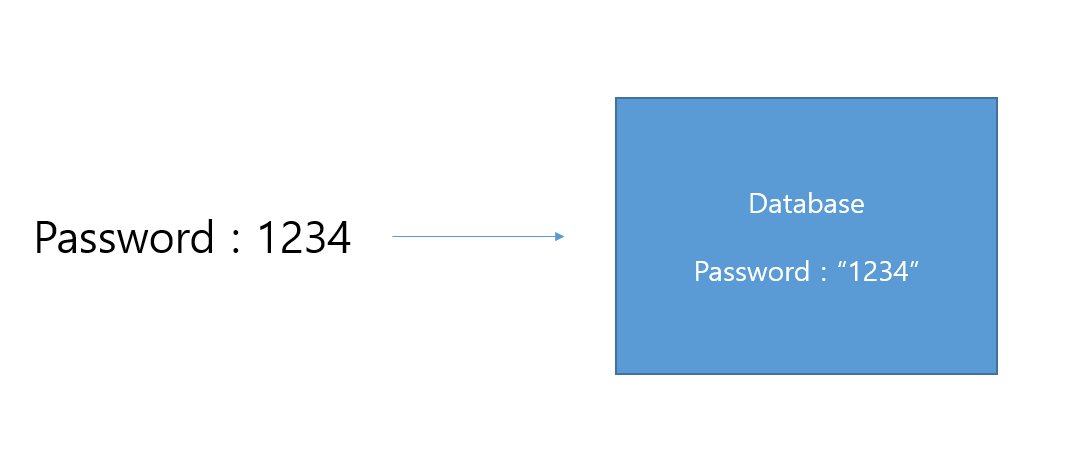우리는 지금까지 비밀번호를 그대로 데이터베이스에 삽입하는 방식을 선택해왔습니다. (아래의 그림처럼 1234를 패스워드로 입력하면 데이터베이스에도 역시 1234가 삽입되는 방식)