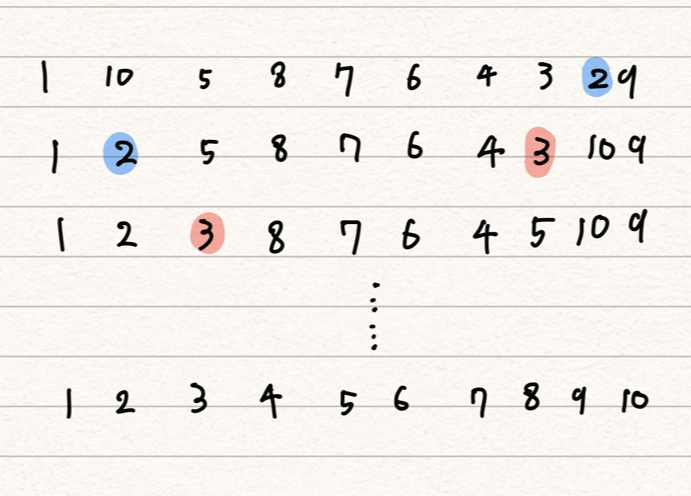 2. 첫번째 인덱스를 제외한 나머지 배열을 조건검사하여 가장 작은 값을 두번째 인덱스와 스위치 시킵니다.