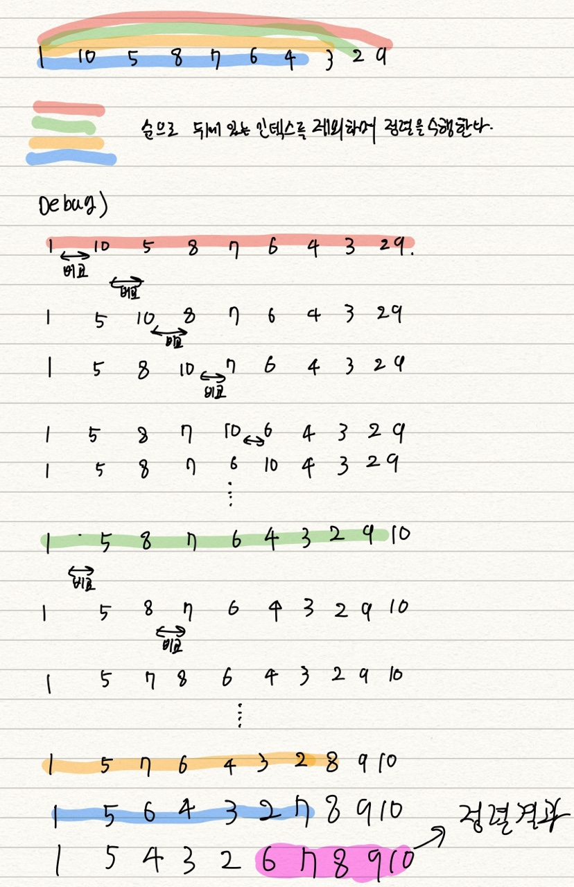 왜냐하면 버블정렬의 아이디어는 바로 원소 자신의 양옆의 인덱스와 비교하여 더 작은값을 앞으로 보내는 것이기 때문입니다.