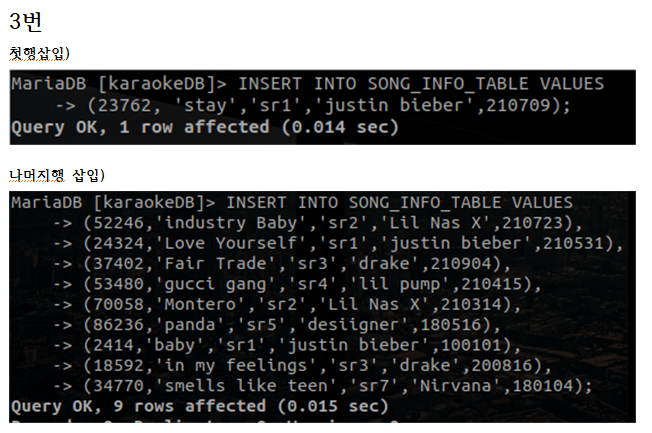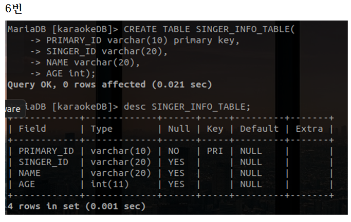 1번. DB이름을 ‘karaokeDB’로 하여 데이터베이스를 생성하고 use 하는 sql을 작성하시오.