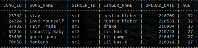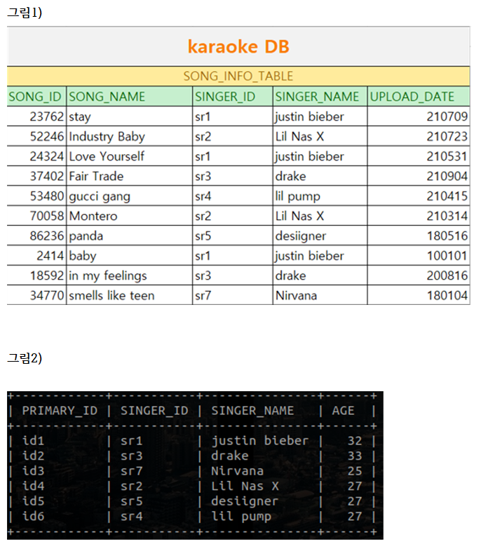 (각 컬럼의 데이터 타입은 위 그림과 같은 데이터들이 들어갈수 있도록 자유롭게 선언하되, SONG_ID 중복데이터 삽입불가, SINGER_NAME은 not null)