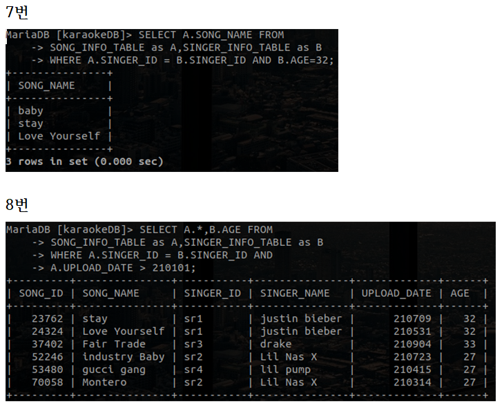 8번. 그림으로 제시된 두가지 테이블은 SINGER_ID 컬럼과 SINGER_NAME 컬럼이 중복요소이다. 중복요소를 적절히 이용하여 UPLOAD_DATE 가 210101 보다 큰 모든 데이터들에 대하여 SONG_INFO_TALBE의 모든 컬럼과 SINGER_INFO_TABLE의 AGE컬럼을 붙여서 조회하는 sql을 작성하시오.