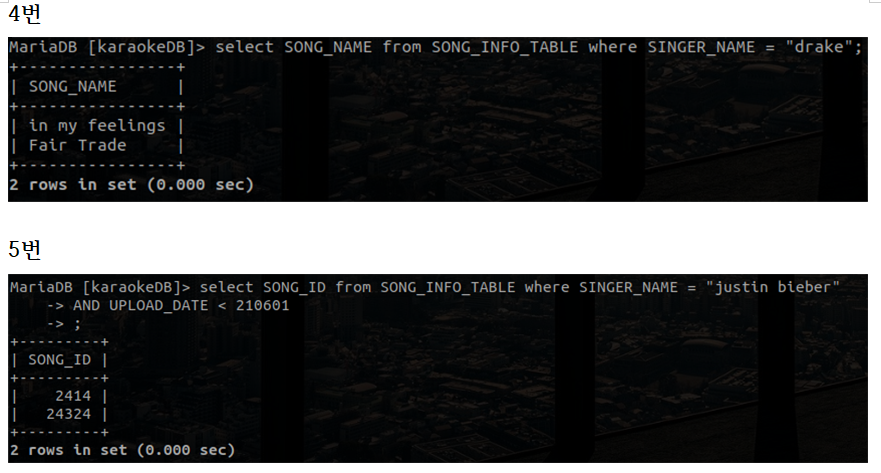 5번. 그림1에서 UPLOAD_DATE가 21년 6월 1일 이전인 데이터 중 가수 이름이 justin bieber인 데이터의 SONG_ID만 모두 조회하는 sql을 작성하시오