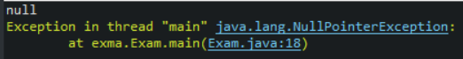 이러한 코드는 출력을 찍을 때에는 null이란 값이 나오지만 해당객체를 접근하는경우 (메소드, 필드에 대한 접근)에는 널포인터 예외를 발생시십니다 해당 코드를 주석을 제거하고 실행한 결과는 아래와 같습니다.