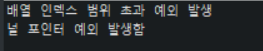 중요한점은 예외가 발생하며 try구문을 바로 빠져나오고 catch가 실행되기 때문에 arr 에러 아래에 발생 가능한 예외인 널포인터 예외는 발생되지 않습니다.