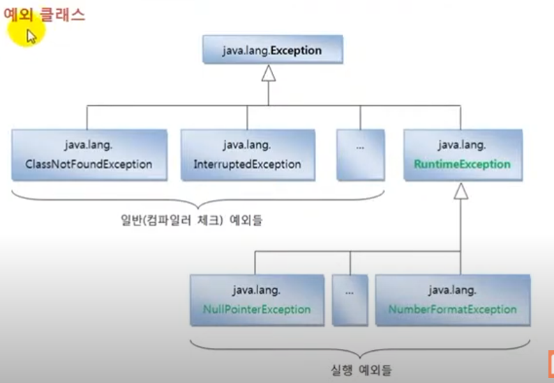 어떠한 예외가 발생을 한다면 그에 맞는 클래스를 찾아 객체로 만들고, 예외가 발생한 이유를 해당 객체안에 저장을 하여 예외처리 코드에서 이용할수 있도록 합니다. 해당 클래스의 상속관계는 아래와 같습니다.