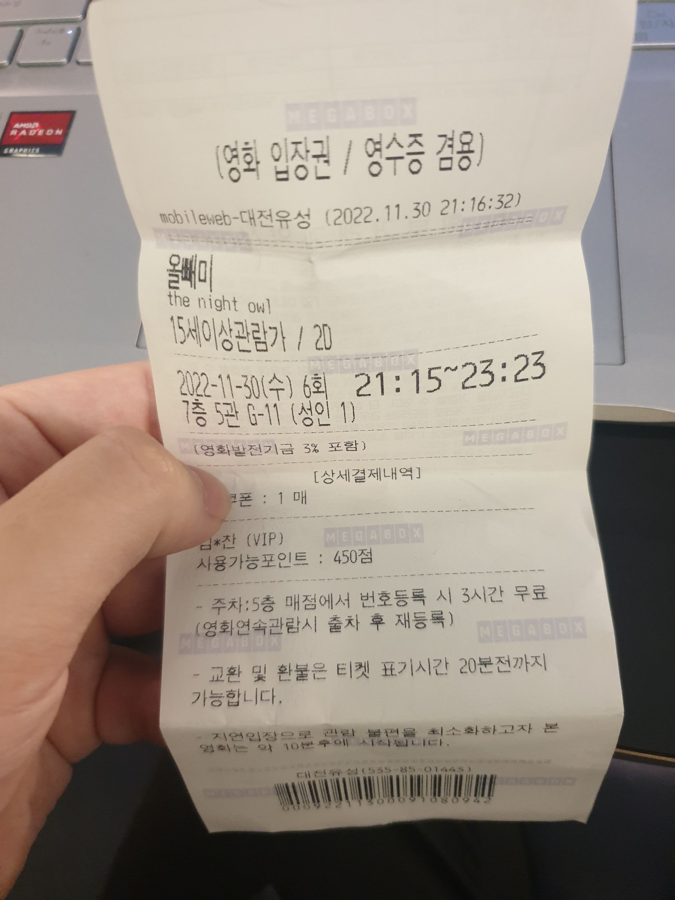 최근에 메가박스 회원가입했는데 VIP 이벤트 당첨되서 꽁짜 표가 4개나 생겼어요! 같이 볼사람도 없어서 다 제꺼입니다 이미 두개써서 올배미랑 압꾸정 봤는데 둘다 볼만했던거 같아요! 올빼미는 심장 약한사람들 한테는 비추입니다. 갑툭튀가 좀 있어요...