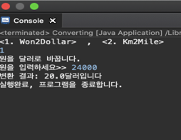 저는 잘 엮어둔 클래스들과 메소드들의 실행이 서로 얽히지 않게 메인메소드를 실행할 클래스를 Converting이라 따로 선언하였습니다. 그리고 메인메소드 내에 조건문을 통해 class Won2Dollar를 실행할 것인가 class Km2Mile를 실행할것인가를 입력받아 둘중하나를 실행할수 있도록 코딩후 마무리 했습니다.