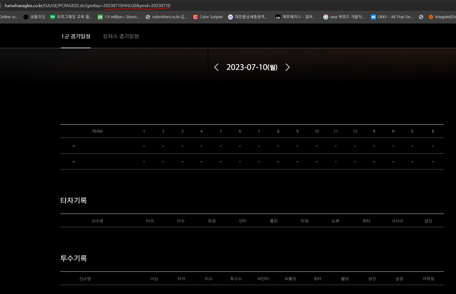 예를들어 아래처럼 경기를 안한날을 억지로 파라미터로 던저서 접근하면 경기 결과데이터가 당연히 화면에 렌더링 되있지 않거덩요, 제가 저거 DOM 구조를 하나하나 분석해서 Data Exists 체크, display none 체크 같은거를 하나하나 일일이 하면 좋겠지만, 귀찮아요~
