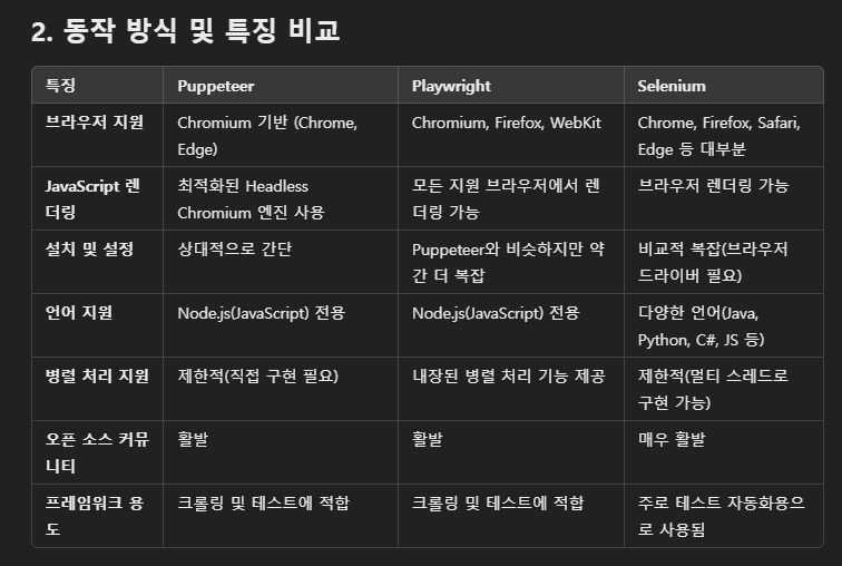 그래서 셀레니움이랑 비교해달라하니 아래 표를 던져줬습니다.