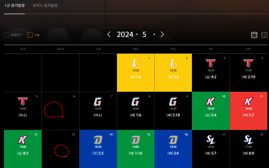 대신에 저 경기결과 페이지 이전페이지에 캘린더 UI를 살펴보면 빨간색 동그라미처럼 경기가 없는날은 데이터들이 비워져있어요