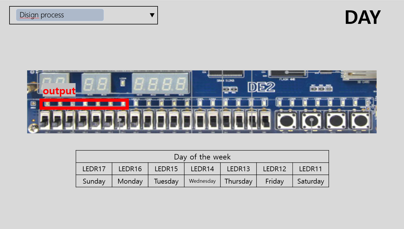 계산된 두가지의 값을 더하여 mod-7연산을 진행하여 최종적인 요일의 타입을 구하는건 to_day_num 모듈의 역할입니다. 마지막으로 넘어온 요일별 숫자를 LED에 표현가능한 신호로 바꿔주는 역할은 day_printer 모듈이 수행하였습니다.