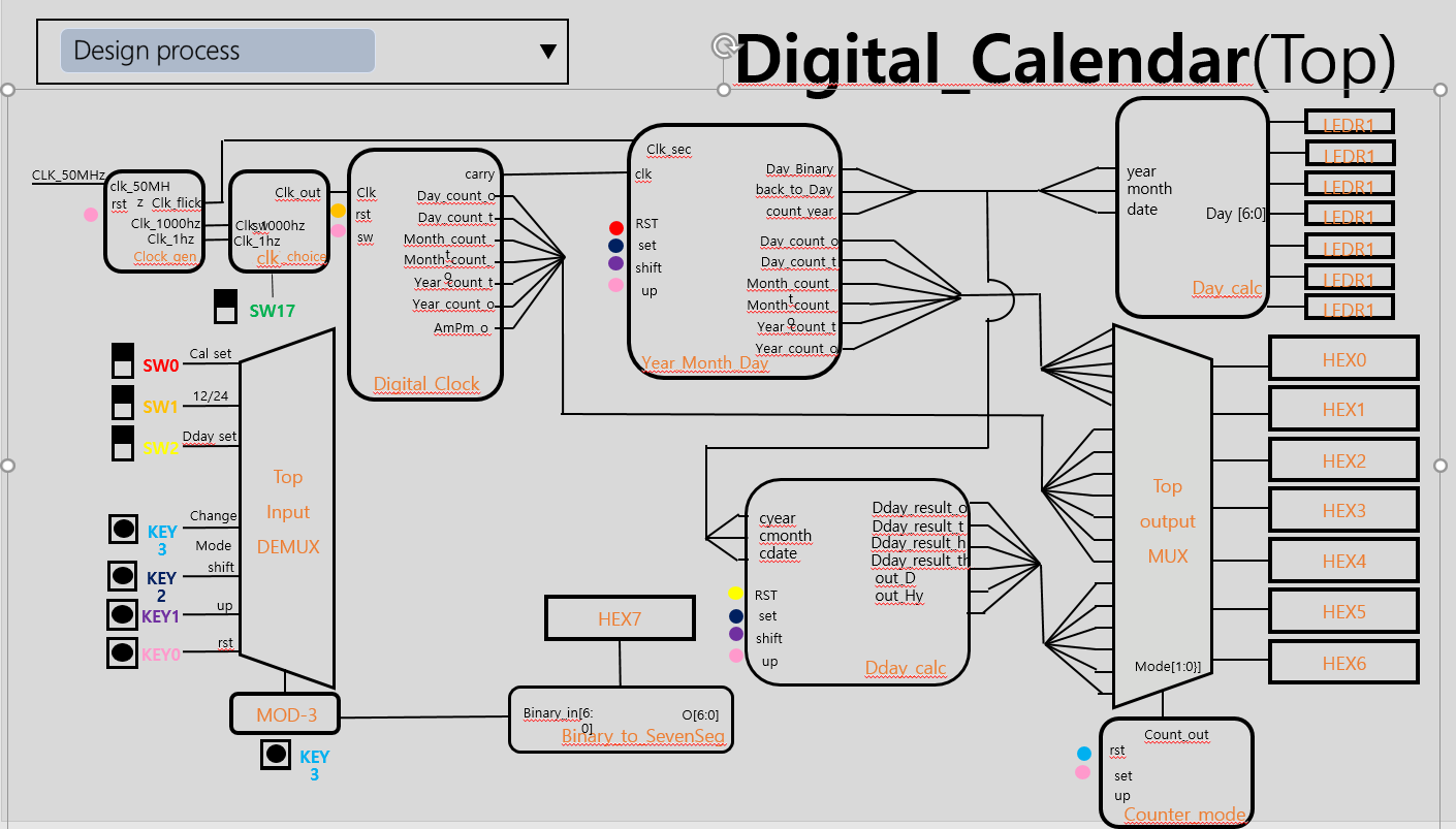 ShinyOcean 2021. 2. 9. 15:56Verilog HDL를 주제로 한 열다섯번째 포스팅은 Digital Calendar 디바이스의 설계 전에 다루었던 시계 모듈을 추가한 최종 Final Top module의 회로도와 시계 모듈의 회로도를 첨부하겠습니다.