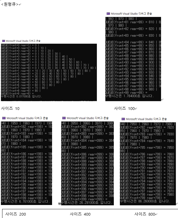 두 형식의 큐를 직접 구현하여 MAX_QUEUE_SIZE를 10, 100, 200, 400, 800, 1000으로 변환하며