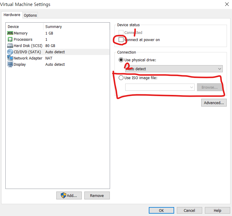 붉은 색으로 표시해둔 부분을 클릭후 CD-ROM탭에서 체크박스를 체워주고