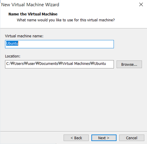 다음은 가상 머신의 이름과 저장위치를 묻게 되는데 사용자의 마음대로 하시면됩니다. 저는 이름은 아무렇게나 하셔도