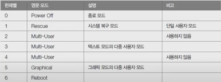 런레벨의 경우 위와 같습니다 앞에서 시스템 종료와 재시작에서 다루었던 명령어인 init명령어의 뒤에
