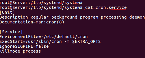 - 서비스의 실행 스크립트 파일은 /lib/systemd/system/ 디렉터리에 '서비스이름.service'라는 이름으로 확인 할수 있습니다. 예로 cron 서비스는 cron.sercive라는 이름의 파일로 존재 합니다.