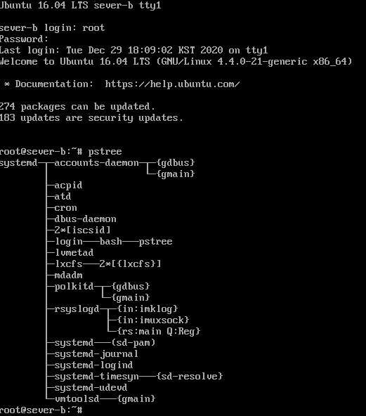 텍스트 모드의 우분투로 부팅후 루트사용자로 로그인하여 pstree명령어를 실행하면 다음과 같습니다,