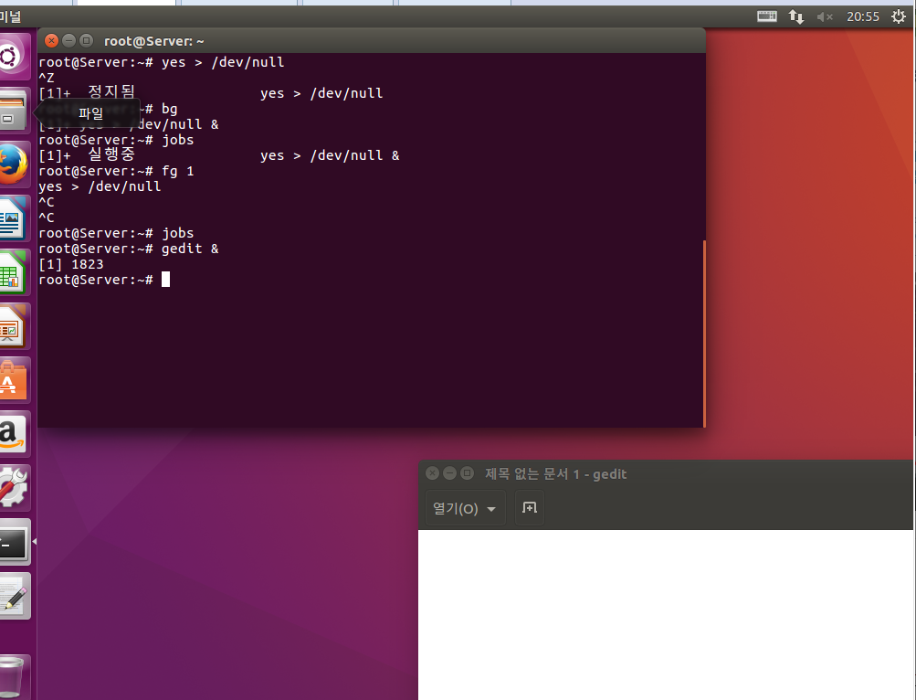 Ctrl +z를 통해 잠시 정지 시킨후 백그라운드로 보내는 명령어 bg를 입력하면