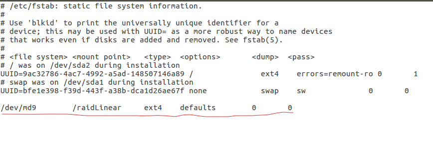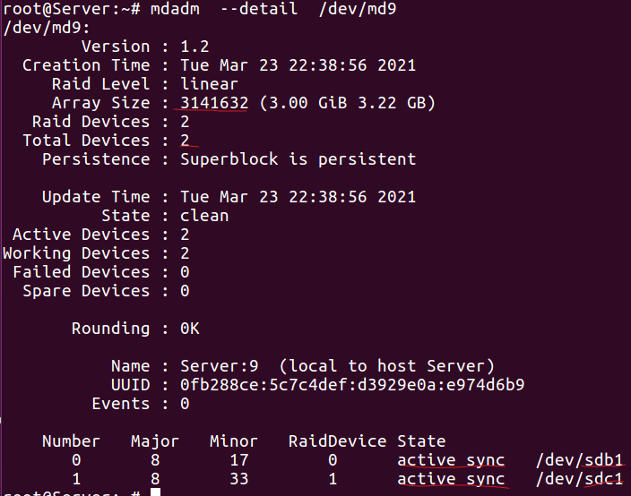 --create 만든다, /dev/md9라는 그룹을, --level 레벨을 linear로, --raid-device=2 묶어줄 장치는 2개로, 장치명, 장치명