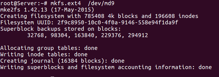 다음은 파일시스템을 생성해 주었습니다. 명령어는 mkfs.ext4 /dev/md9 입니다.
