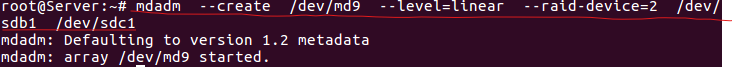 mdadm --create /dev/md9 --level=linear --raid-device=2 /dev/sdb1 /dev/sdc1