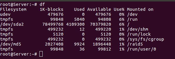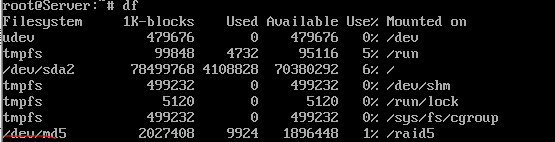 재부팅후 df 명령으로 확인하면 응급 복구 모드에서 해준것과 같이 RAID5만 동작하는것을 확인할수 있습니다.