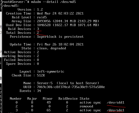 디테일 하게 확인해보면 3개의 디스크중 2개가 살아있는것을 확인할수 있습니다.
