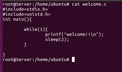 C언어로 작성한 이 프로그램은 그냥 2초에 한번씩 welcome이라는 메세지를 무한히 출력하는 프로그램입니다 이를 ubuntu 사용자의 홈디렉터리에 컴파일후 실행파일 형태로 남겨둔후 telnet서버로 접속하여 실행해보겠습니다.