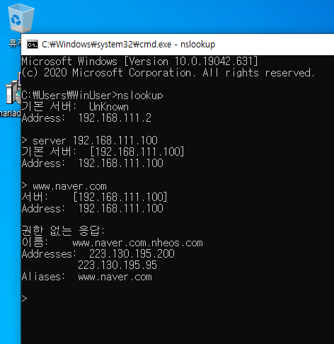 다음은 nslookup 명령어를 실행하여 결과를 확인하면 다음과 같습니다.