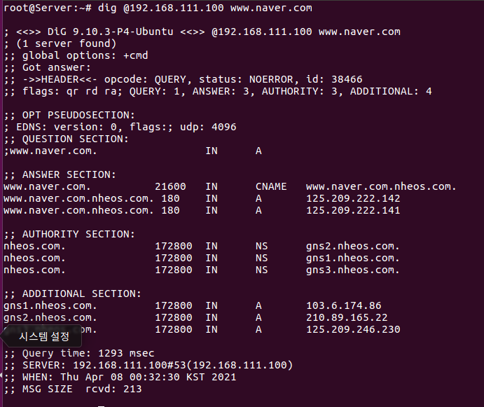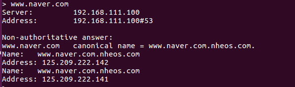 먼저 네임서버의 주소를 구축한 서버의 주소로 변경해주고 naver의 주소를 검색하면 결과는 아래와 같습니다.