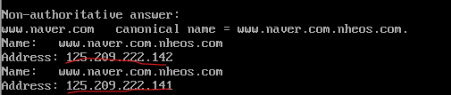 예를 들어 naver.com 을 nslookup 명령어를 통해 검색해보면 아래처럼 두개의 네임서버가 존재하여 사용자를 분배하여 주는것을 확인할수 있습니다, 물론 내부적으론 더 많은 서버가 운용되고 있겠지만요!