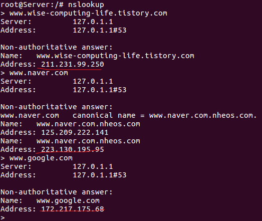 먼저 서로다른 세개의 웹사이트 주소를 이용하기위해 nslookup 명령어를 이용해 네이버,구글,저의 개발블로그 ip 주소를 검색해보겠습니다.