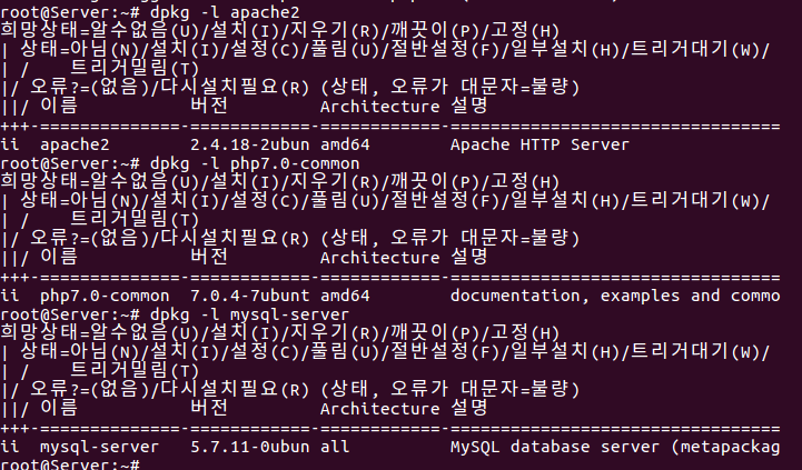 설치 완료후 dpkg -l 명령으로 apache2, php7.0-common, mysql-server 패키지가 설치되었는지 확인해줍니다.