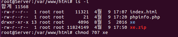 압축을 해제하고 나면 위와 같이 xe 디렉터리가 생성되는데, 일반사용자가 게시판에 글을 업로딩하거나 할때 접근할수 있도록 권한을 위와 같이 수정해줍니다.