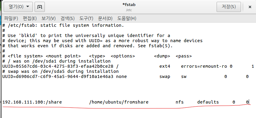 그런데 이제 한번 사용하고 말것이 아니라 재부팅시에도 서버에 연결이 되어 항상 공유되었으면 좋겠죠 저번 카테고리의 raid에서 다루었던 fstab파일을 설정해주면 됩니다