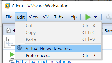워크스테이션 프로를 실행후 상단의 edit탭의 virtual network editor를 눌러줍니다.